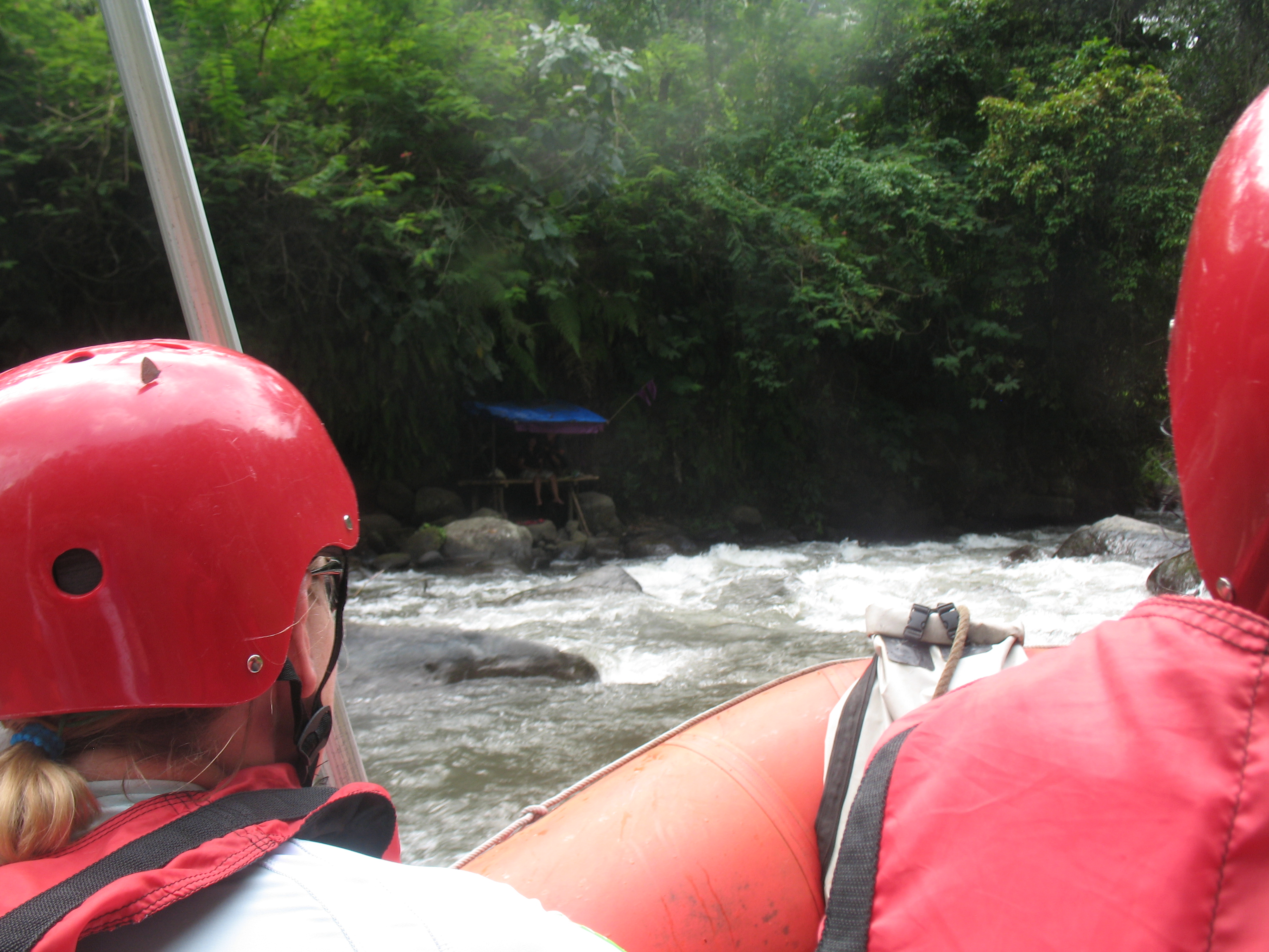 Um 8:30 Uhr wurden wir heute Morgen nach dem Frühstück in dem benachbarten Kaffee des Adhi Cottage abgeholt. Nach 45 Minuten Autofahrt kamen wir am Startpunkt unserer Rafting Tour an und wurden gleich mit Schwimmweste und Helm ausgestattet. Nach kurzer Einweisung ging es dann mit unserem Bootsführer zu fünft auf die zweistündige Tour. Es hat allen viel Spaß gemacht und das Bad im Fluss war sehr erfrischend. Am Endpunkt konnte man sich auch gleich duschen und es gab ein warmes Mittagessen. Abends waren wir dann wieder im Sagitarius Restaurant nur etwas links die Straße runter. Hier ist das Essen sehr lecker und der Koch versteht sein Handwerk was sich auch in den mit frisch gepressten Obst zubereiteten Cocktails bemerkbar macht.