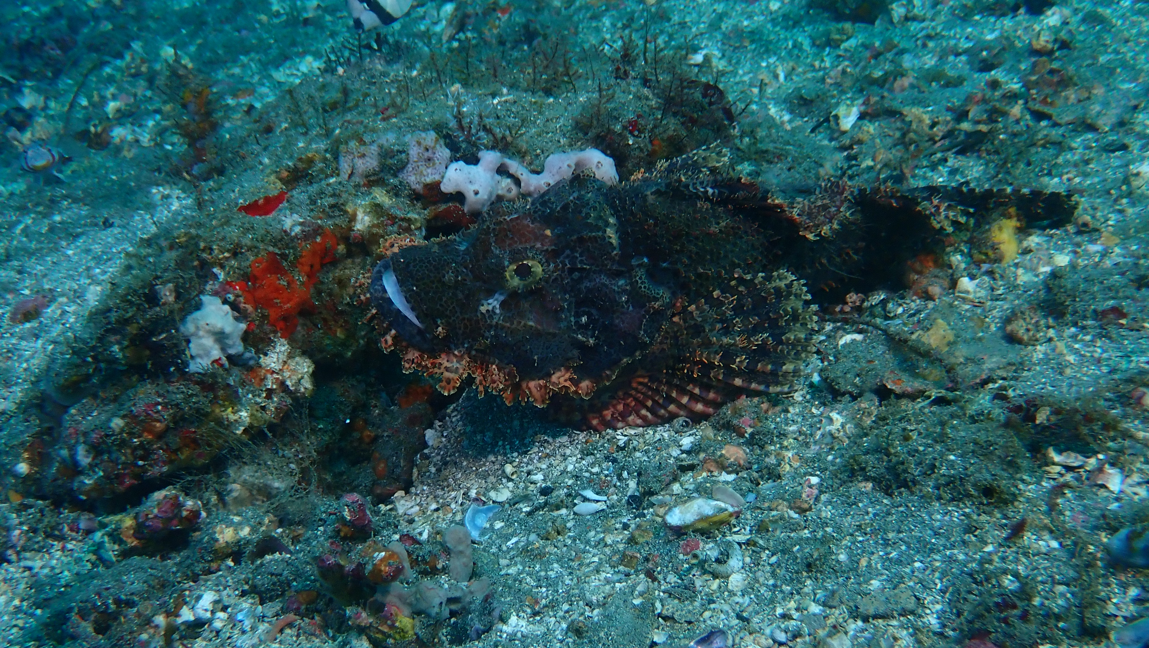 Wir haben heute 2 Tauchgänge am alten Landungssteg nur 10 Bootsminuten von unserer Tauchbasis entfernt unternommen. Die Stützen, auf welchen der Steg ruht, sind sehr schön bewachsen. Auch viele Weichkorallen befinden sich daran. Mit ein wenig Suchen lassen sich, neben den üblichen Fischen, viele Steinfische, Anglerfische, Seenadeln, Krokodilfische und viele Igelfische finden. Ein sehr entspannter TG.