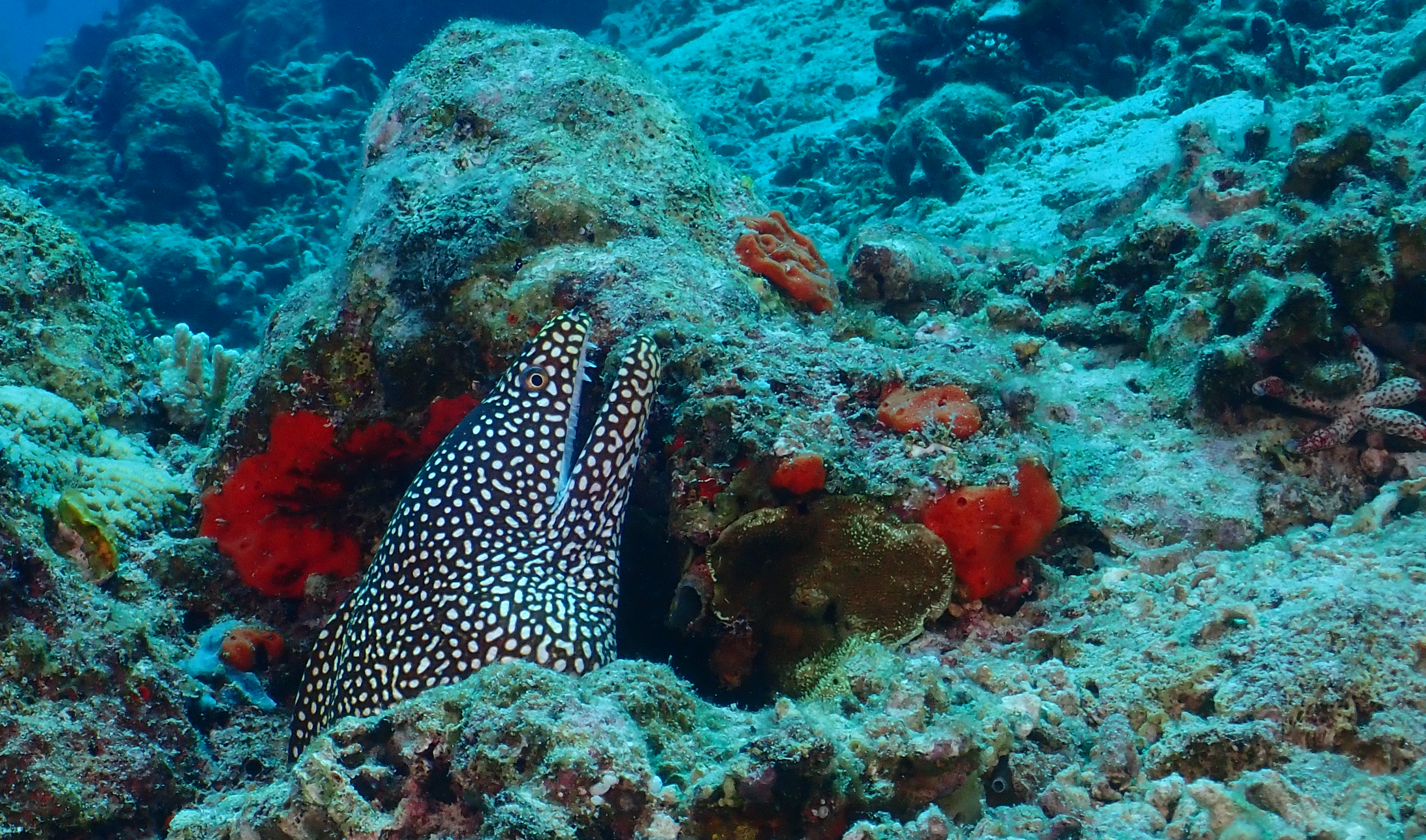 Heute sind wir wieder nach Menjangan gefahren und haben beim ersten TG am Blue Corner ein Pygmäen Seepferdchen gesehen. Der zweite TG am Sandslope war sehr entspannend mit einem Frogfisch und einer gepunkteten Muräne als Highlight.