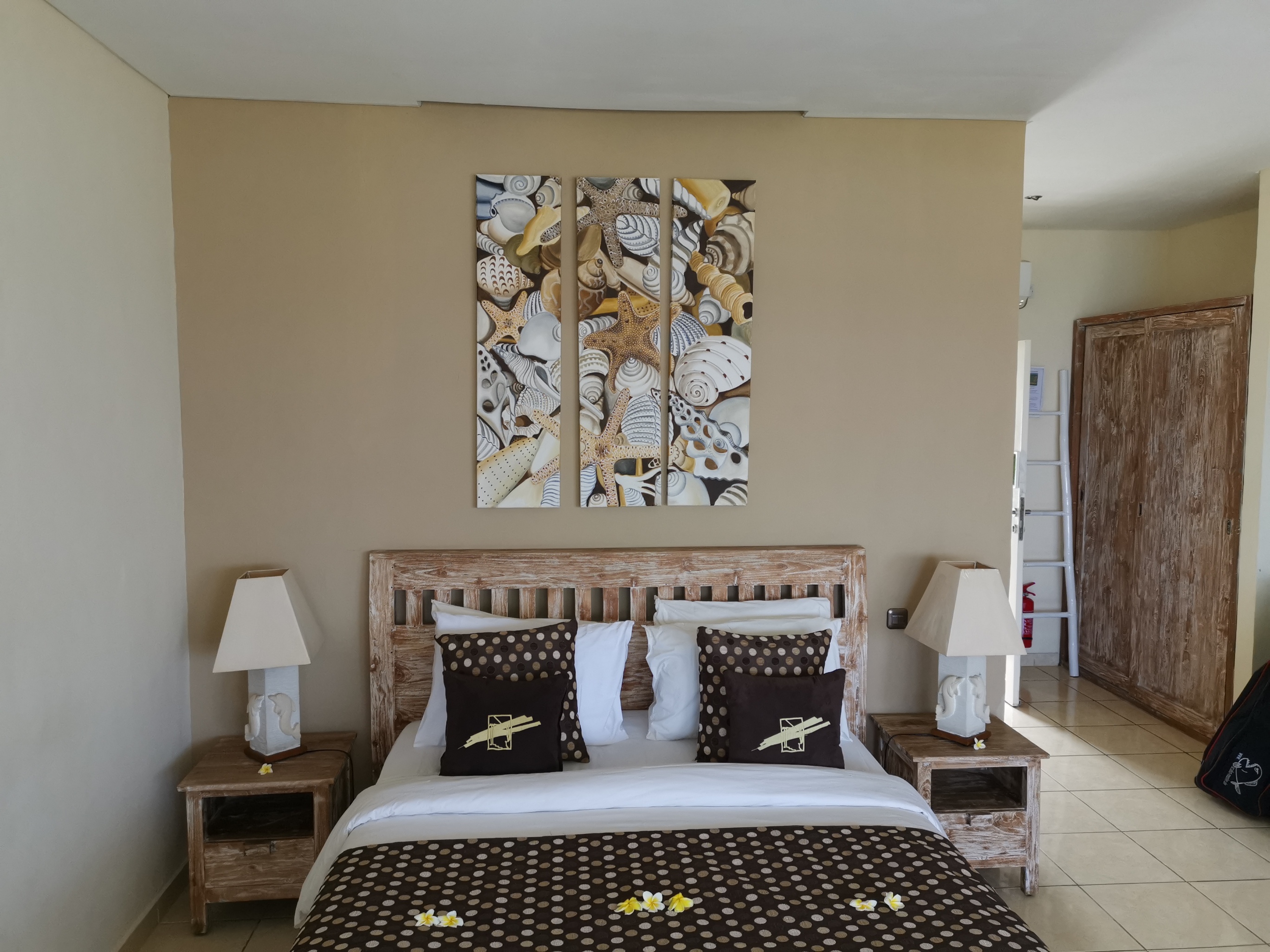 Wir sind heute kurz vor 11:00 Uhr zu unserem letzten Resort der Rundreise dem "Tauch Terminal Tulamben" aufgebrochen. Die Fahrt hat 3 anstrengende Stunden gedauert da unser Fahrer mit Höchstgeschwindigkeit aber einem Kleinbus welcher immer durchgeschlagen hat unterwegs war. Die Zimmer sind aber sehr schön mit Blick auf Meer und Pool. Anschließend haben wir uns noch zum Tauchen morgen um 08:00 Uhr angemeldet und gemütlich im Resort gegessen.