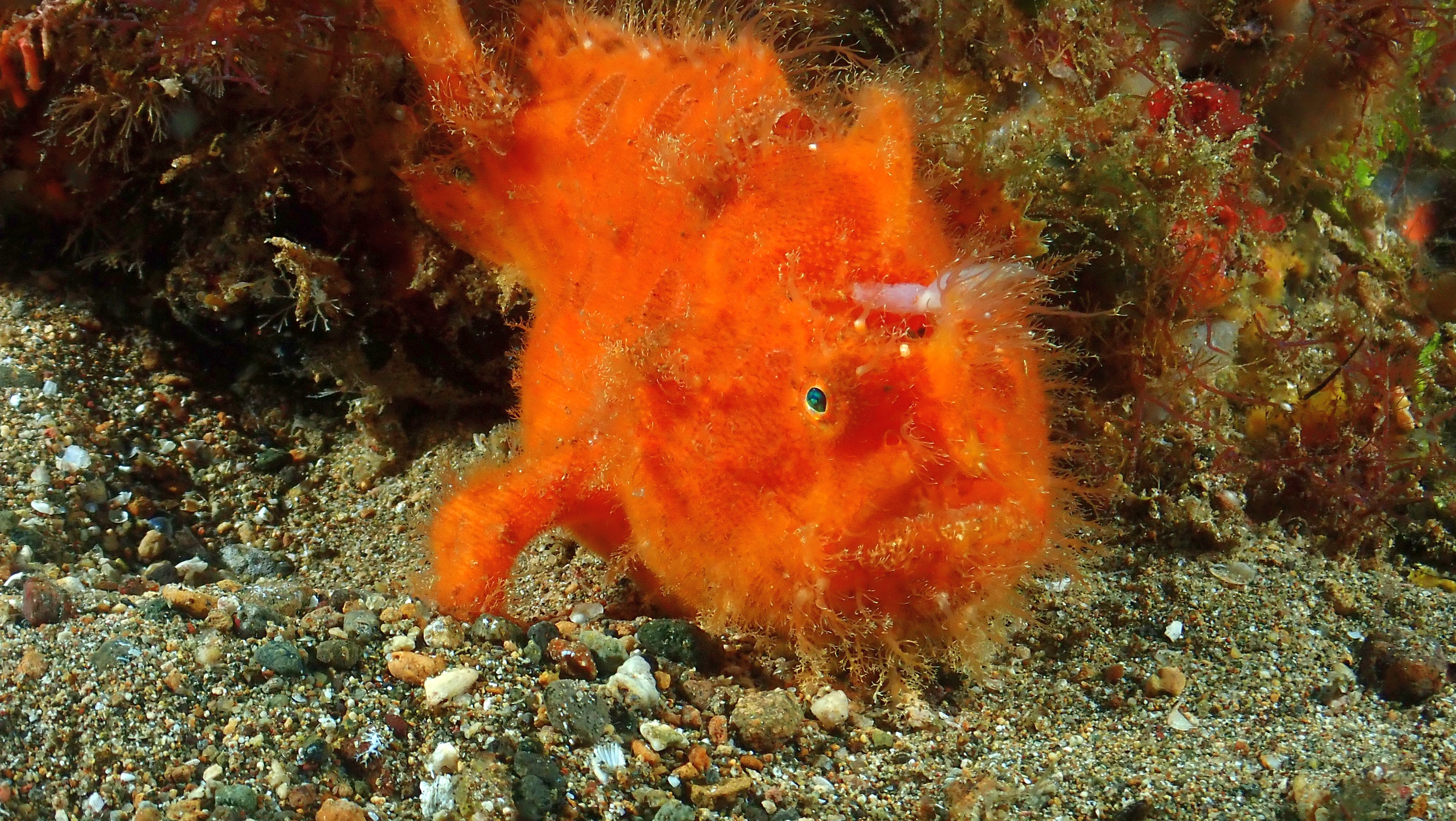 Heute haben wir 3 Tauchgänge unternommen. Der erste an einer Steilwand mit vielen Schnecken. Der zweite auf Sand war sehr schön. Unter anderen sahen wir einen Geisterpfeifenfisch, Seepferdchen und eine Flammenden Sepia. Der dritte war dann gleich vor dem Resort, mit dem Highlight eines haarigen Anglerfisches.
