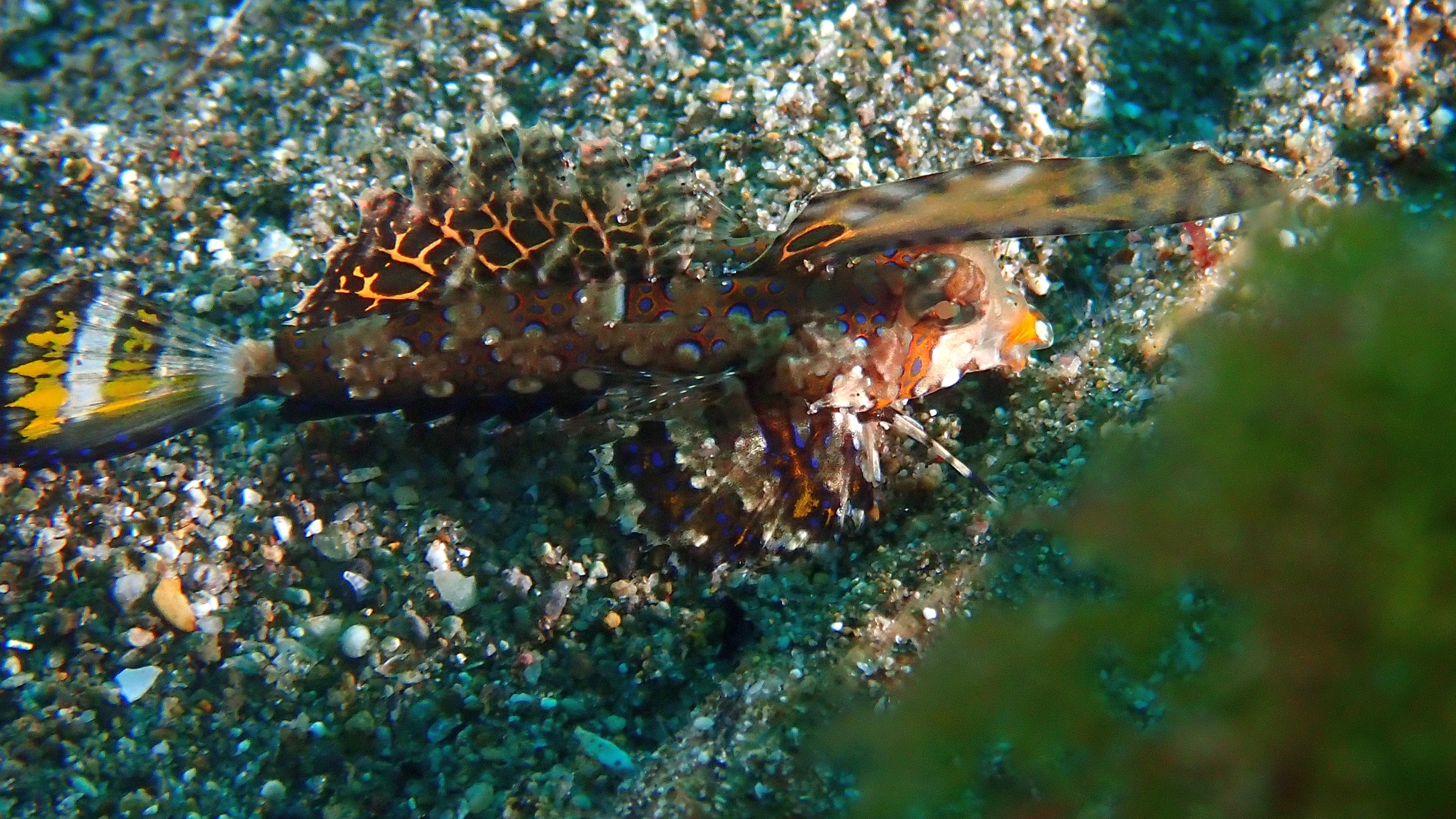 Heute konnten wir bei den Tauchgängen ein paar Meister der Tarnung erleben. Die "Mimikry Fadenschnecke" sieht aus wie eine Weichkoralle und der "Schmuck Geisterpfeifenfisch" wie ein Federstern. Wenn der "Seegras Geisterpfeifenfish" nachahmt, sagt ja schon der Name. Den lustigsten Namen hat die "Donald Duck Garnele". Am niedlichsten war aber der winzige rote Anglerfisch und die kleine "Flammende Sepia".