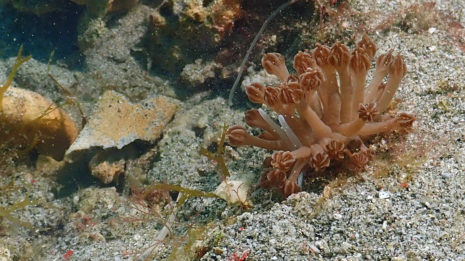 Heute konnten wir bei den Tauchgängen ein paar Meister der Tarnung erleben. Die "Mimikry Fadenschnecke" sieht aus wie eine Weichkoralle und der "Schmuck Geisterpfeifenfisch" wie ein Federstern. Wenn der "Seegras Geisterpfeifenfish" nachahmt, sagt ja schon der Name. Den lustigsten Namen hat die "Donald Duck Garnele". Am niedlichsten war aber der winzige rote Anglerfisch und die kleine "Flammende Sepia".
