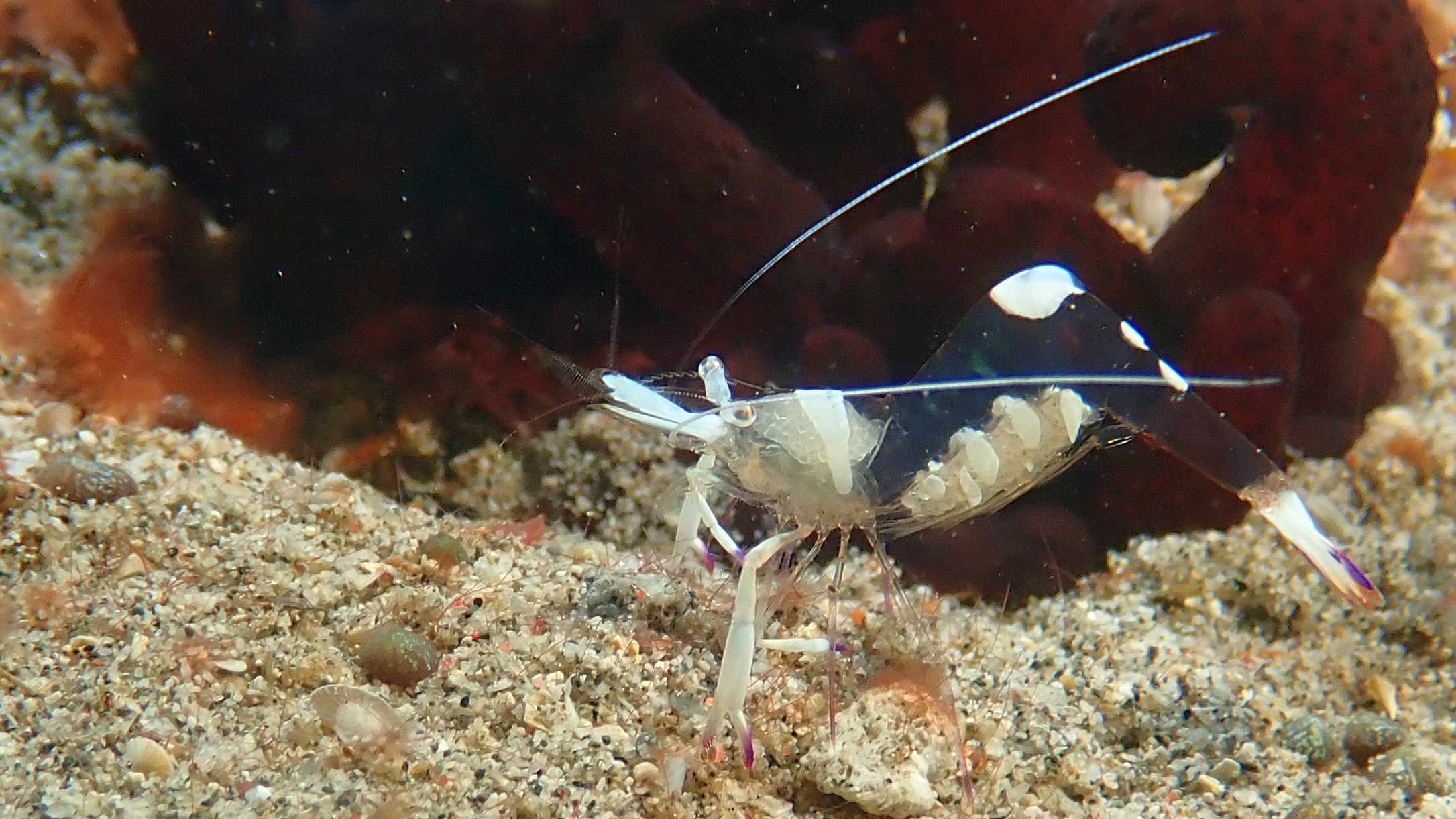 Heute konnten wir bei den Tauchgängen ein paar Meister der Tarnung erleben. Die "Mimikry Fadenschnecke" sieht aus wie eine Weichkoralle und der "Schmuck Geisterpfeifenfisch" wie ein Federstern. Wenn der "Seegras Geisterpfeifenfish" nachahmt, sagt ja schon der Name. Den lustigsten Namen hat die "Donald Duck Garnele". Am niedlichsten war aber der winzige rote Anglerfisch und die kleine "Flammende Sepia".