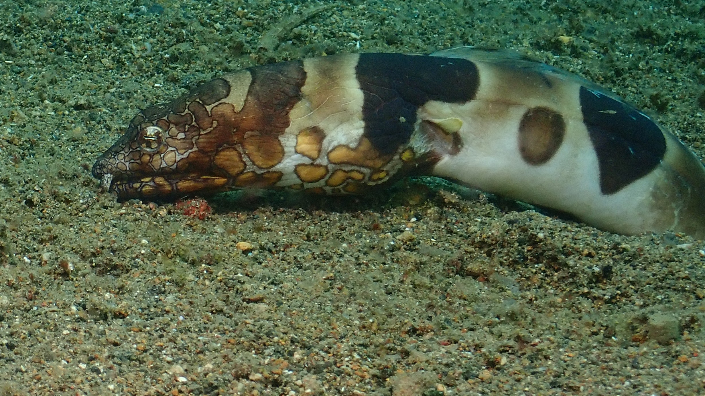 Beim ersten Tauchgang haben wir neben Krabben und Garnelen auf Seesternen wieder einen roten Anglerfisch gesehen. Während des austauchens kam dann ein Sandaal herausgekrochen. Beim zweiten Tauchgang waren die Highlights eine "Orang-Utan-Krabbe" auf dem Sand, 2 "Schmuck Geisterpfeifenfische" vor einem Federstern und vor allem die "Flammende Sepia".