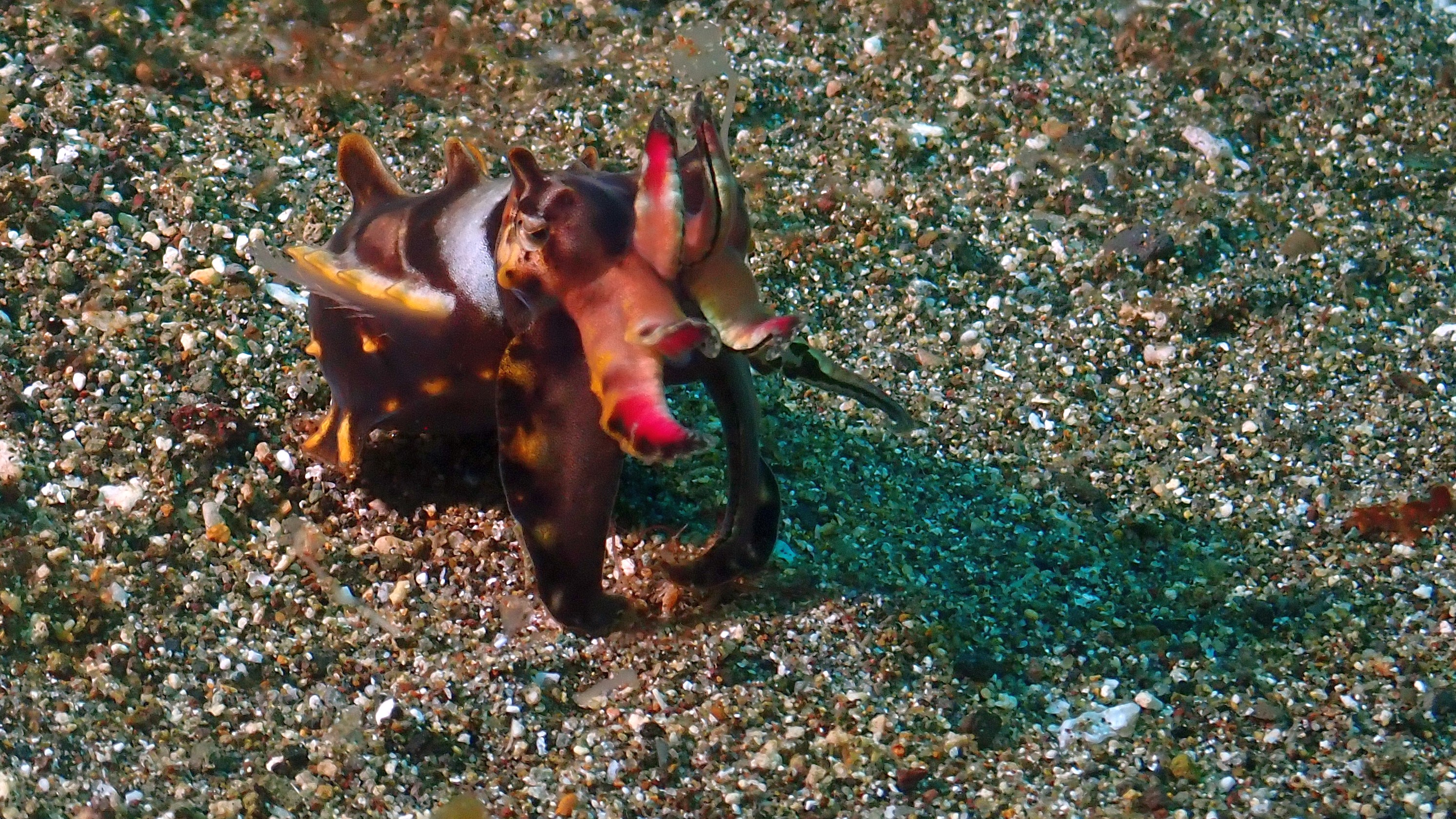 Beim ersten Tauchgang haben wir neben Krabben und Garnelen auf Seesternen wieder einen roten Anglerfisch gesehen. Während des austauchens kam dann ein Sandaal herausgekrochen. Beim zweiten Tauchgang waren die Highlights eine "Orang-Utan-Krabbe" auf dem Sand, 2 "Schmuck Geisterpfeifenfische" vor einem Federstern und vor allem die "Flammende Sepia".