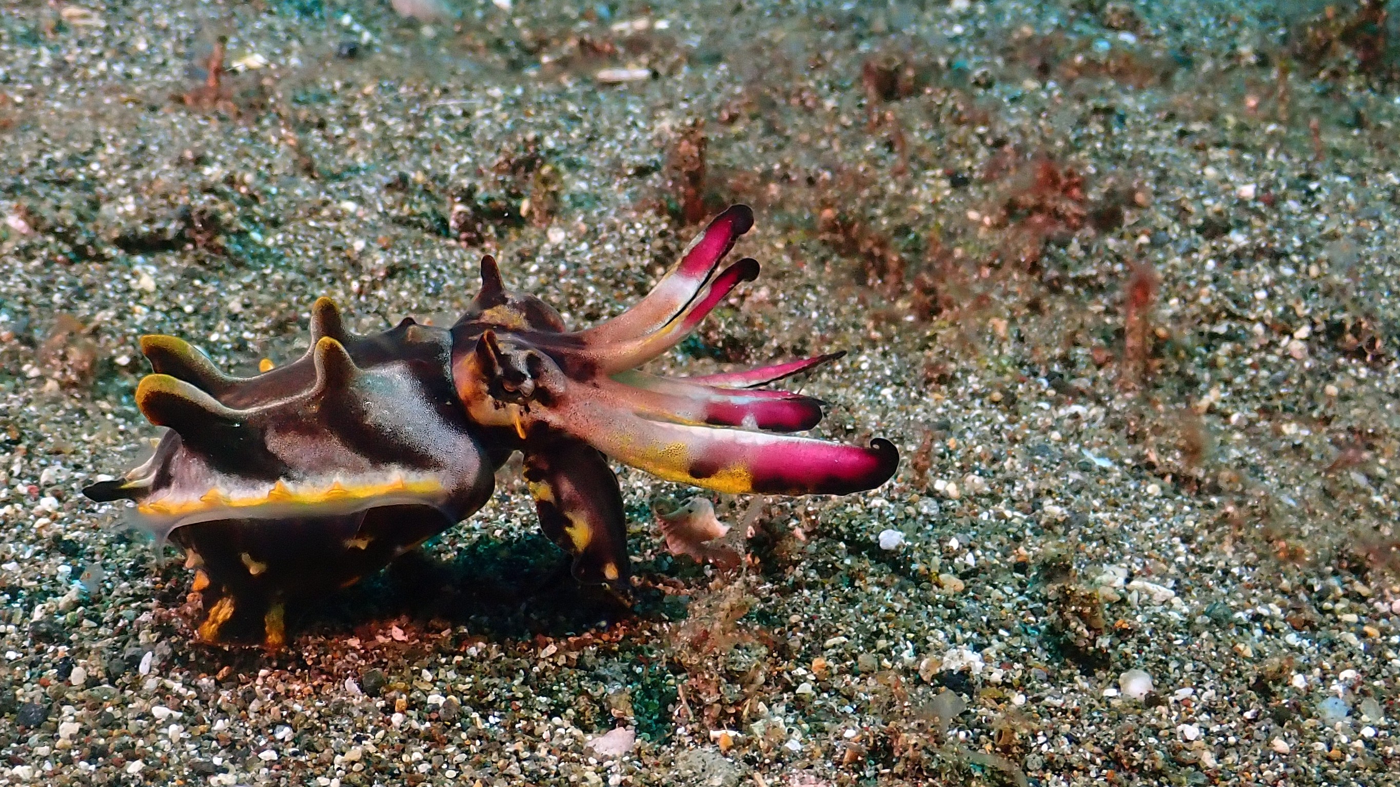 Beim ersten Tauchgang haben wir neben Krabben und Garnelen auf Seesternen wieder einen roten Anglerfisch gesehen. Während des austauchens kam dann ein Sandaal herausgekrochen. Beim zweiten Tauchgang waren die Highlights eine "Orang-Utan-Krabbe" auf dem Sand, 2 "Schmuck Geisterpfeifenfische" vor einem Federstern und vor allem die "Flammende Sepia".