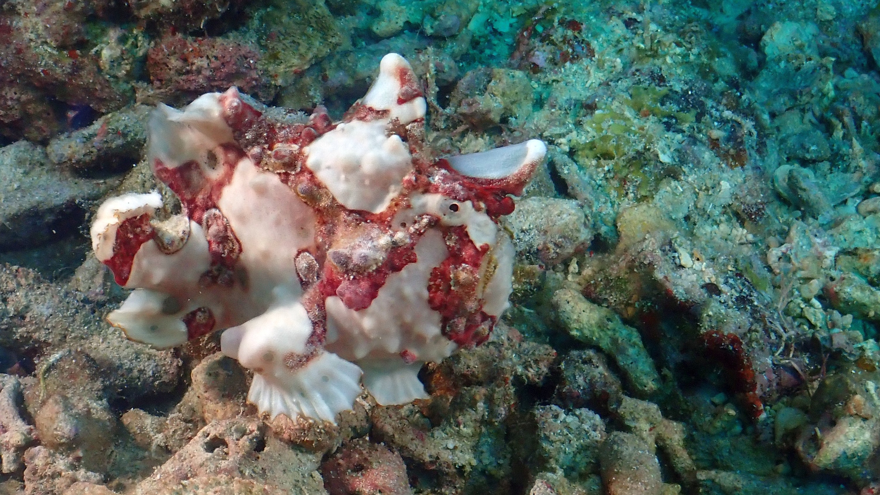 Heute gab es wieder viele Anglerfische zu sehen. Erst ein weißer mit Flecken auf der Suche nach einem neuen Standort. Gut zu sehen ist in dem Filmchen, wie er das mit dem Maul aufgenommene Wasser stoßartig aus den hinten liegenden Kiemenöffnungen presst und so vorwärtskommt. Aber auch der orange und der ganz kleine Anglerfisch waren sehr schön. Nicht zu vergessen war auch die Harlekingarnele und der Fangschreckenkrebs. Zum Schluss kurz vor Erreichen der Nullzeit habe ich dann noch ein Perlhuhn Kugelfisch in seiner Jugendform gesehen.