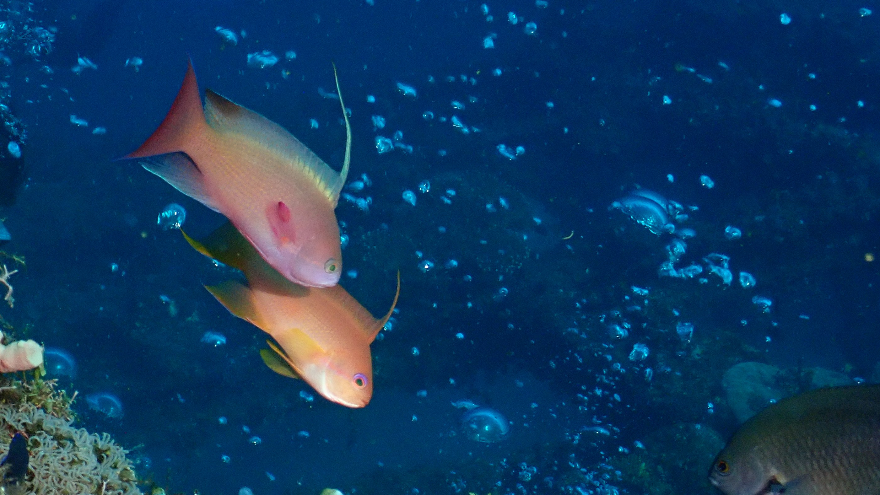Heute gab es wieder viele Anglerfische zu sehen. Erst ein weißer mit Flecken auf der Suche nach einem neuen Standort. Gut zu sehen ist in dem Filmchen, wie er das mit dem Maul aufgenommene Wasser stoßartig aus den hinten liegenden Kiemenöffnungen presst und so vorwärtskommt. Aber auch der orange und der ganz kleine Anglerfisch waren sehr schön. Nicht zu vergessen war auch die Harlekingarnele und der Fangschreckenkrebs. Zum Schluss kurz vor Erreichen der Nullzeit habe ich dann noch ein Perlhuhn Kugelfisch in seiner Jugendform gesehen.