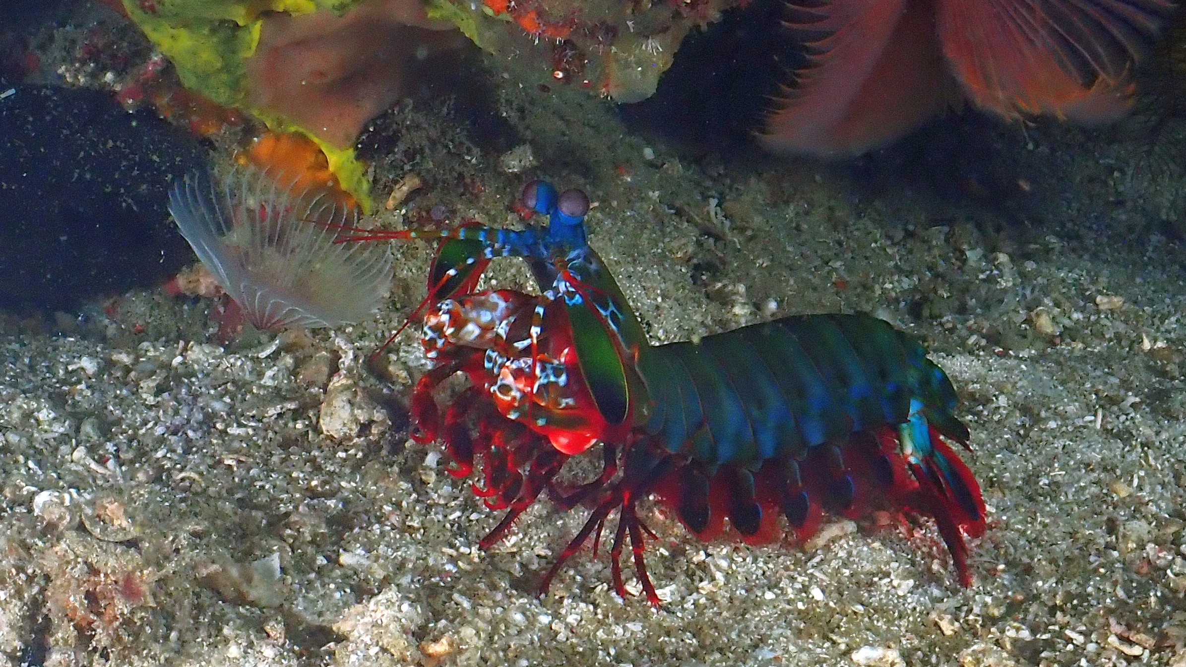 Heute gab es wieder viele Anglerfische zu sehen. Erst ein weißer mit Flecken auf der Suche nach einem neuen Standort. Gut zu sehen ist in dem Filmchen, wie er das mit dem Maul aufgenommene Wasser stoßartig aus den hinten liegenden Kiemenöffnungen presst und so vorwärtskommt. Aber auch der orange und der ganz kleine Anglerfisch waren sehr schön. Nicht zu vergessen war auch die Harlekingarnele und der Fangschreckenkrebs. Zum Schluss kurz vor Erreichen der Nullzeit habe ich dann noch ein Perlhuhn Kugelfisch in seiner Jugendform gesehen.