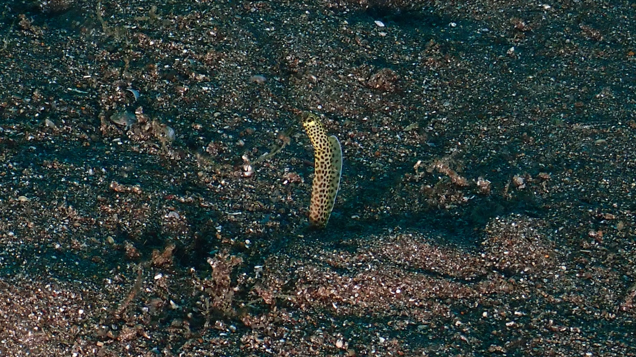 Heute gab es wieder viele Anglerfische zu sehen. Erst ein weißer mit Flecken auf der Suche nach einem neuen Standort. Gut zu sehen ist in dem Filmchen, wie er das mit dem Maul aufgenommene Wasser stoßartig aus den hinten liegenden Kiemenöffnungen presst und so vorwärtskommt. Aber auch der orange und der ganz kleine Anglerfisch waren sehr schön. Nicht zu vergessen war auch die Harlekingarnele und der Fangschreckenkrebs. Zum Schluss kurz vor Erreichen der Nullzeit habe ich dann noch ein Perlhuhn Kugelfisch in seiner Jugendform gesehen.
