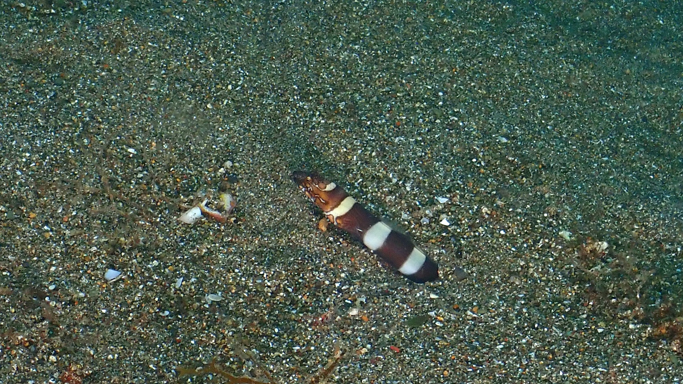 Heute gab es wieder viele Anglerfische zu sehen. Erst ein weißer mit Flecken auf der Suche nach einem neuen Standort. Gut zu sehen ist in dem Filmchen, wie er das mit dem Maul aufgenommene Wasser stoßartig aus den hinten liegenden Kiemenöffnungen presst und so vorwärtskommt. Aber auch der orange und der ganz kleine Anglerfisch waren sehr schön. Nicht zu vergessen war auch die Harlekingarnele und der Fangschreckenkrebs. Zum Schluss kurz vor Erreichen der Nullzeit habe ich dann noch ein Perlhuhn Kugelfisch in seiner Jugendform gesehen.