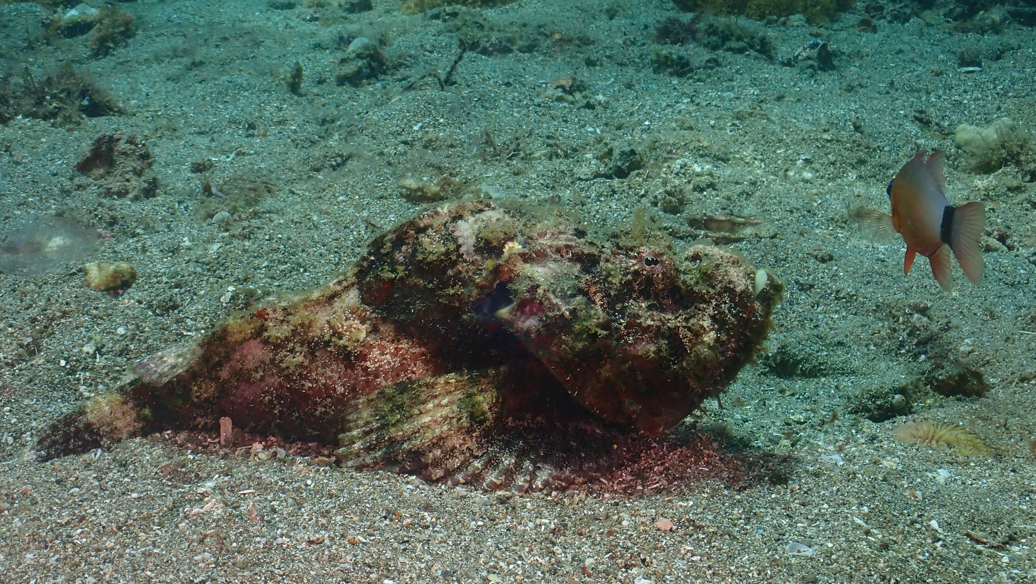 Während des ersten Tauchgangs haben wir einen Tiger-Shrimp, einen kleinen weißen Anglerfisch und an einer weißen Gorgonie dann Korallengarnelen und Seegras-Feilenfische gefunden. Beim zweiten Tauchgang ist uns gleich eine Schildkröte begegnet. Daneben konnten wir uns noch die Eier des Clownfisches, Schnepfenmesserfische und einen Drachenkopf im Sand ansehen. Beim dritten Tauchgang an einer schönen Steilwand fanden wir Schnecken, eine Muräne und viele Rifffische.
