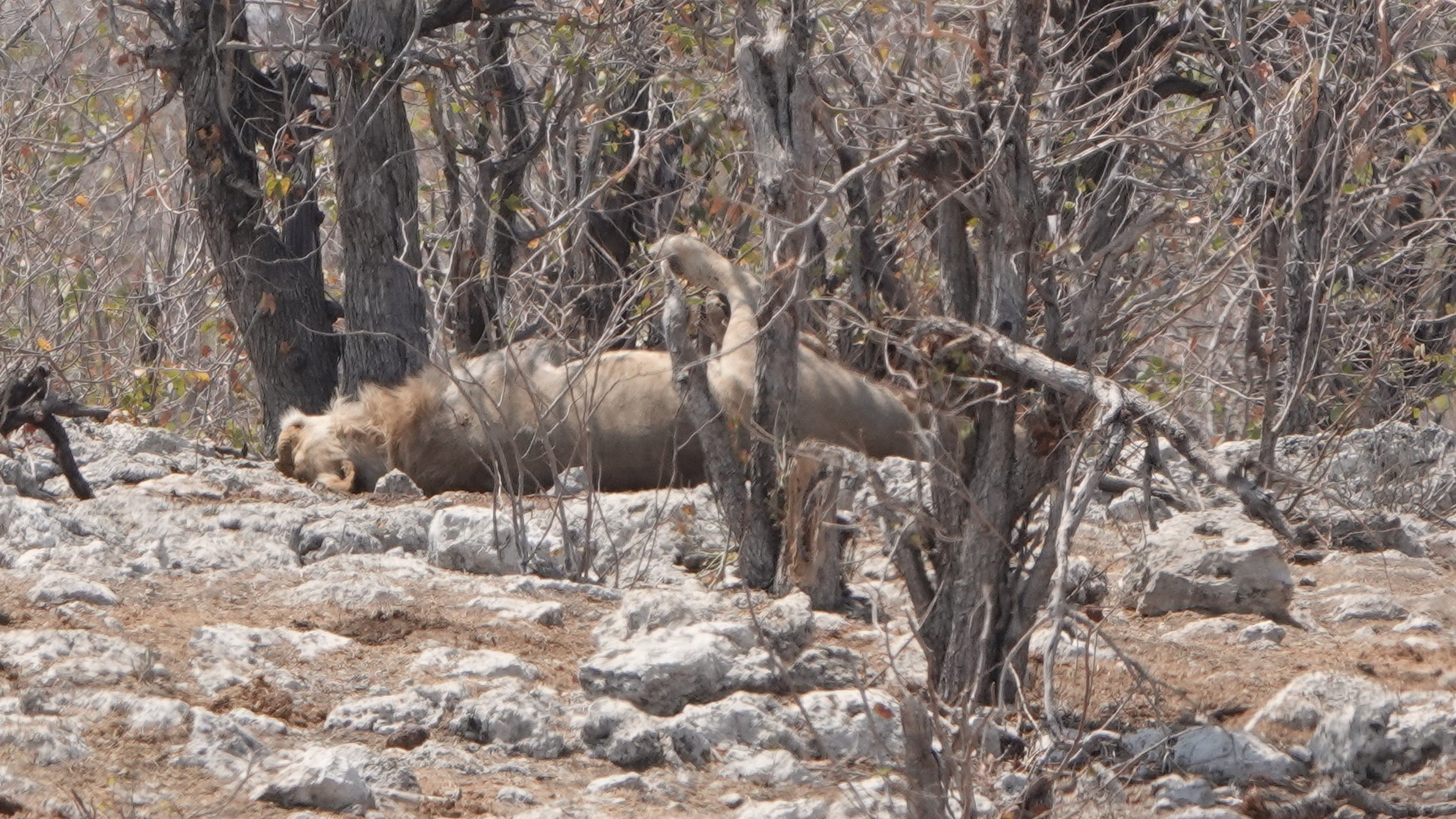 Am Parkeingang "Okaukuejo" bezahlten wir unser Tagesticket und setzten die Fahrt fort, vorbei an den Wasserlöchern "Gemsbokvlakte", "Olifantsbad" und schließlich "Aus". Dort entdeckten wir einen toten Elefanten, während ein Löwe im Schatten ruhte und geduldig auf seinen nächsten Hunger wartete.