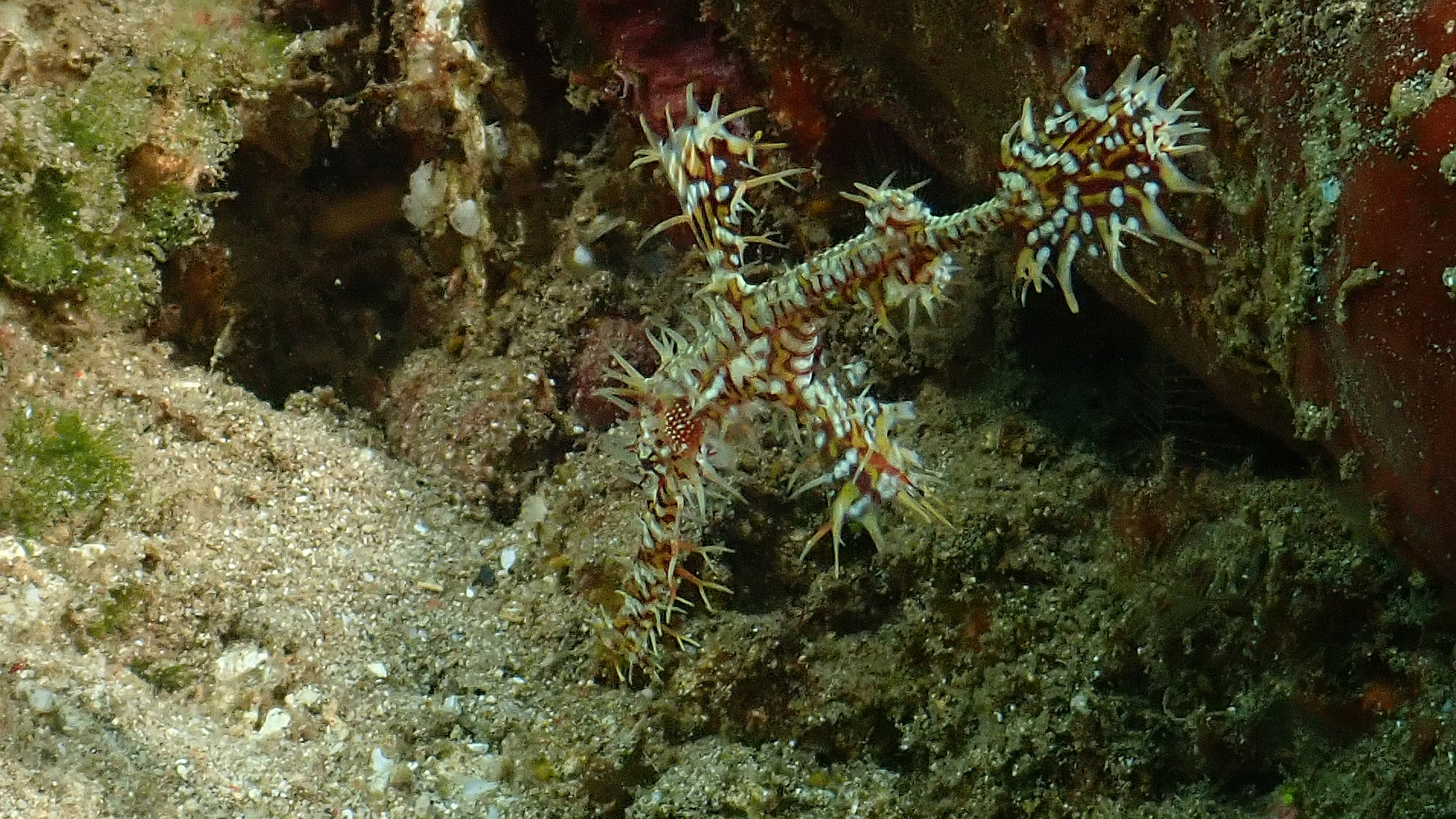 Diesmal führte uns das Boot auf die Festlandseite in Richtung Manado, wo wir zwei spannende Tauchgänge unternahmen. Besonders beeindruckend waren ein eleganter Geisterpfeifenfisch und – als Highlight – ein Geisterfetzenfisch. Ein gebänderter Kieferfisch sorgte außerdem für ein Schmunzeln, als er rückwärts in seine Höhle „einparkte“.