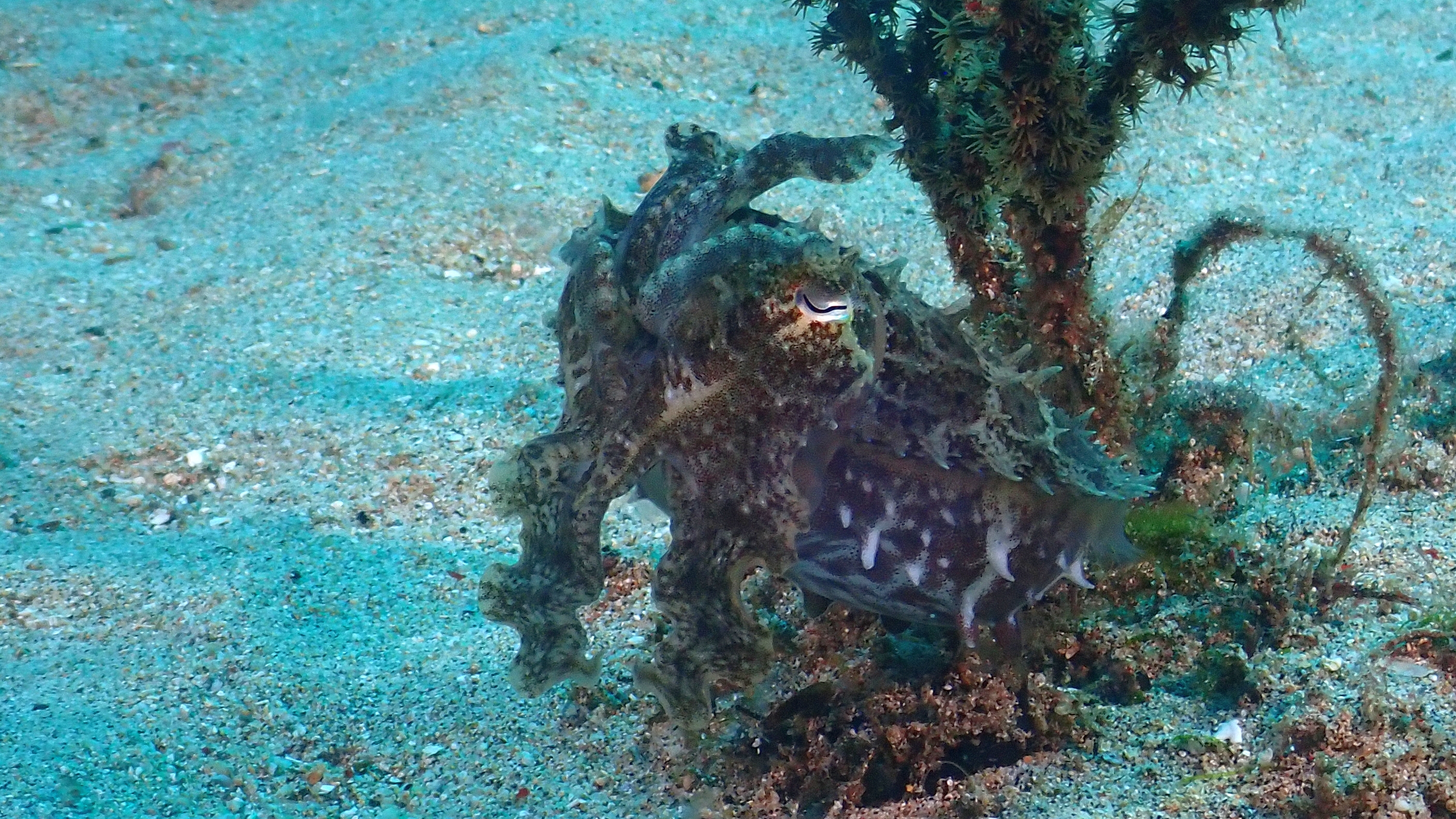 Heute ging es ein letztes Mal mit den Celebes Divers hinaus aufs Meer. Ziel waren zwei wunderschöne Plätze am Festland. Unter Wasser erwartete uns noch einmal eine bunte Vielfalt: ein neugieriger Oktopus, eine seltene Geistermuräne, mehrere Schaukelfische, flinke Garnelen und als besonderes Highlight ein kleiner, leuchtend gelber Anglerfisch. Ein perfekter Abschluss unserer Tauchgänge. Am Abend ließen wir den Tag ruhig ausklingen und genossen vom Steg aus den Sonnenuntergang – ein stimmungsvoller Abschied von dieser unvergesslichen Zeit.